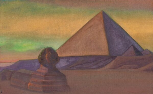 Что касается Сфинкса, то египтологи считают, что его построил фараон Хафра (Хефрен), строитель второй по величине пирамиды и предшественник фараона Хеопса, и, соответственно, древность ему дают 4500 лет. В связи с этим хочется привести малоизвестную, но очень интересную картину Н.К. Рериха, которая называется «Египет».