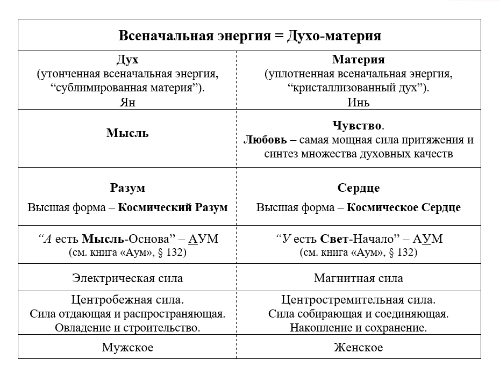 На основе Записей и писем Е.И. Рерих мы можем установить следующие соотношения. Тот полюс единой духо-материи, который мы представляем и описываем как «Дух», в проявленном бытии раскрывается как Мысль и её высшая эволюционная форма – Коллективный (Космический, Высший) Разум. Это центробежная сила, характеризуемая Духовным Учителем как «отдающая и отталкивающая»6. Она направлена на распространение и овладение. Это Мужское начало. В сакральном слове «АУМ» это первый звук «А есть Мысль-Основа»7. Это также электрическая сила8. Она характеризуется как положительная9.