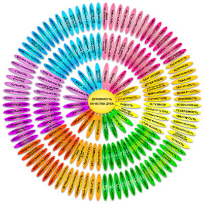 Палитра духовно очищенных чувств отражена в «Цветке качеств духа». Цветок качеств – это и цветок лучших духовных чувств. Дело в том, что в жизненной практике все эти качества человек переживает как чувства – радости, сострадания, великодушия, честности, мужества, ответственности и т.д. Но только самые устойчивые из них становятся качествами, закрепленными в виде кристаллических структур в тонких оболочках микрокосмоса.