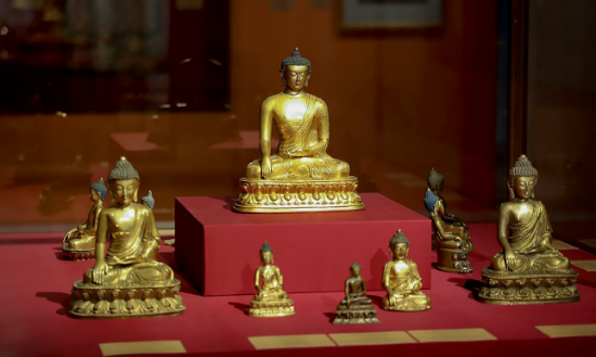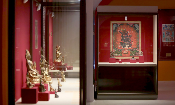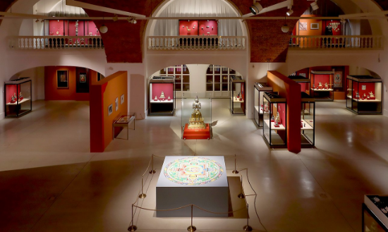 Экспозиция в эффектном пространстве Манежа Малого Эрмитажа представляет почти 500 предметов буддийского искусства: скульптура, тангка, печатные доски для ксилографии, маски для мистерии «цам»