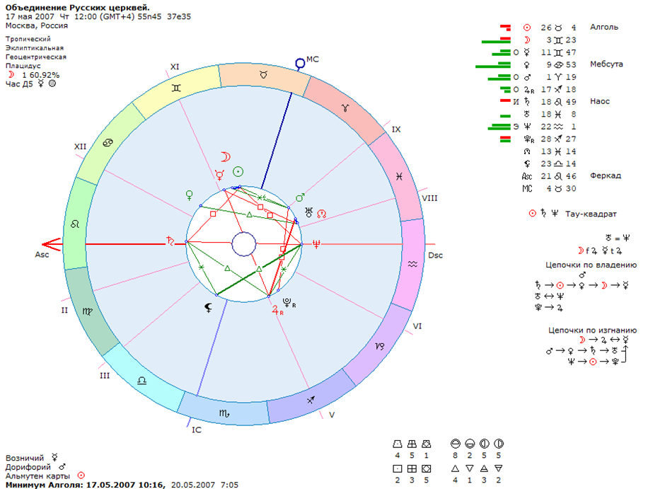Шифр микрокосма символического объединения: Солнце 26 Тельца; Луна 3 Близнецов; Меркурий 12 Близнецов; Венера 10 Рака; Сатурн 19 Льва; Юпитер 17 Стрельца; Плутон 28 Стрельца; Нептун 22 Водолея; Уран 18 Рыб; Марс 1 Овна