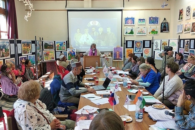 Далее вниманию слушателей был представлен глубокий культурологический анализ, посвященный связи идей Рериха с историческим прошлым человечества. С докладом «Символика Знамени Мира в традиционном искусстве Казахстана» выступила Наталия Баженова, заместитель руководителя Культурного Центра имени Н.К.Рериха, руководитель отдела прикладного искусства Государственного музея искусств Республики Казахстан имени Абылхана Кастеева и член Союза художников Республики Казахстан. Ее выступлению предшествовало вдохновляющее вступительное слово Вадима Ханифовича Ахтямова, члена Культурного Центра имени Н.К.Рериха и председателя Алматинского Фонда поддержки культуры «Сердце Азии». В своем обращении Вадим Ханифович подчеркнул не только глобальное эволюционное значение Пакта Рериха, но и его исключительную важность в предотвращении международных конфликтов. Особо отметив, что 2025 год ознаменован 80-летием Победы в Великой Отечественной войне, он напомнил о героическом вкладе казахского народа в эту священную Победу. Выступающий тепло пригласил всех присутствующих посетить Казахстан – страну с богатейшим духовным наследием, традиционной культуре которой и был посвящен доклад Наталии Баженовой. После такого глубокого и вдохновляющего вступления аудитория была готова ощутить мир древних казахских символов, где наследие Рериха обретает яркое и осязаемое воплощение.