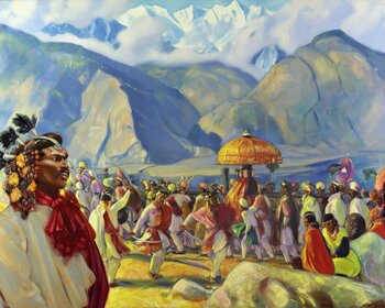 Во время индийского Нового Года вся долина Кулу отмечает праздник. Нам сказали, что богиня Трипура-Сундари выразила желание посетить нас. Триумфальное шествие богини, ее сестры Бхутанты и бога Нага прибыло. Перед нашим домом поставлен длинный ряд многоцветных знамен. Немного дальше – множество барабанов, труб и изогнутых медных рогов. Позже в прекрасно вышитых костюмах, всю дорогу танцуя, с изогнутыми саблями пришли жрецы, гуры, кадары и местные танцоры. На широком дворе процессия остановилась. Каждый из трех паланкинов богов был покрыт серебряными и золочеными масками. Музыка гремела, пелись песни, и начался дикий воинственный танец с мечами. Подобно кавказским горцам или меченосцам Курдистана, сыны древней воинственной долины бешено, но грациозно кружились в танце.
