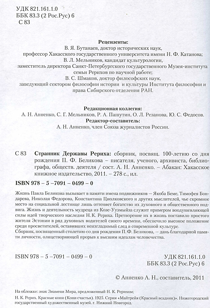 На конференции прошла презентация книги «Странник Державы Рериха» (Странник Державы Рериха: сборник, посвящ. 100-летию со дня рождения П. Ф. Беликова - писателя, ученого, архивиста, библиографа, обществ. деятеля /сост. А. Н. Анненко. - Абакан: Хакасское книжное издательство, 2011. - 278 с., ил. ISBN 978 - 5 - 7091 - 0499 – 0).