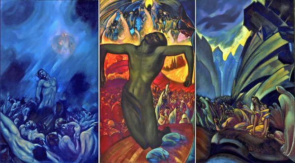 Центральной темой триптиха является мысль о том, что человечество периодически само себя распинает. И это будет продолжаться до тех пор, пока человек не изживет уродливые проявления своего “я” и не возвысится до новой и светоносной жизни, как “Освободившийся человек”, разорвав оковы своей низшей сущности.
