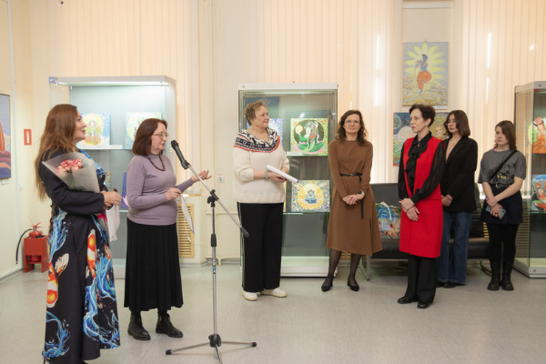 В ответном слове Наталья Николаевна Черкашина поздравила автора с открытием и поблагодарила организаторов за радушный прием. Она охарактеризовала экспозицию как «прекрасное подношение к 100-летию Людмилы Васильевны Шапошниковой» и отметила ее огромную работу в деле популяризации космизма в живописи. Наталья Николаевна рассказала о многолетнем сотрудничестве Лолы Лонли с МЦР и роли Людмилы Васильевны Шапошниковой в её становлении как художника-космиста. В творчестве Лолы Лонли Наталья Николаевна выделила три составляющих аспекта: художественную технику, мифологию, антропологию. В конце своего выступления она вручила директору Краеведческого музея в подарок книгу Л.В.Шапошниковой «Николай Рерих» из серии «Жизнь замечательных людей», выпущенную МЦР в 2024 году совместно с издательством «Молодая гвардия» в честь 150-летия со дня рождения Н.К.Рериха.