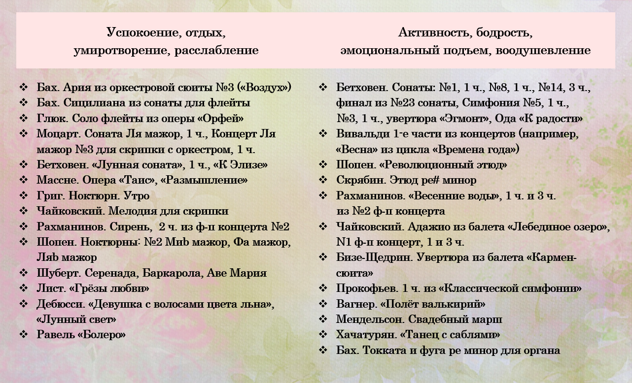 Когда я училась в институте Бурденко по расшифровке ЭЭГ(электроэнцефалография), то занятия проводили нейрофизиологи. С ними очень интересно общаться. Они проводили и такие исследование, как влияние различной музыки на ЭЭГ человека. И влияние это было очень заметно, на тяжёлый рок ЭЭГ становилась хаотичной, на классическую музыку наоборот отмечалась нормализация ЭЭГ. После этого исследования стали применять классическую музыку для реабилитации больных после тяжёлой черепно-мозговой травмы, и была отмечена выраженная положительная динамика.